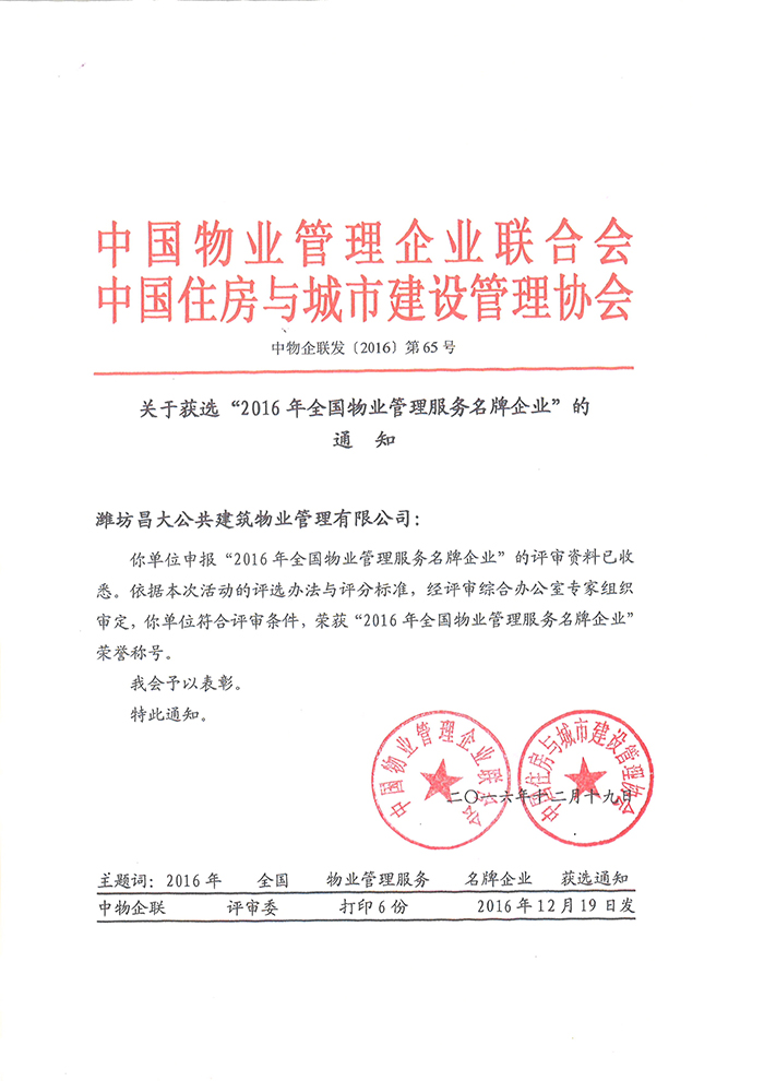 2016年度全國物業(yè)管理服務(wù)名牌企業(yè)