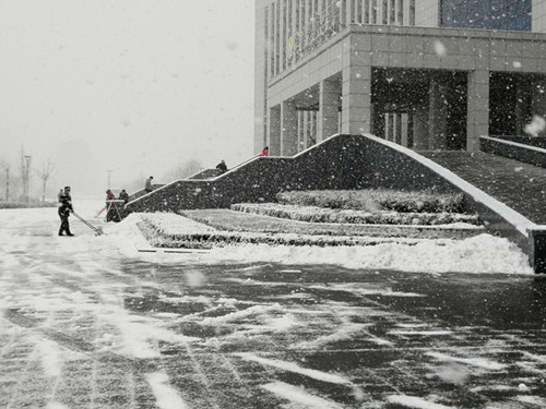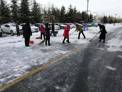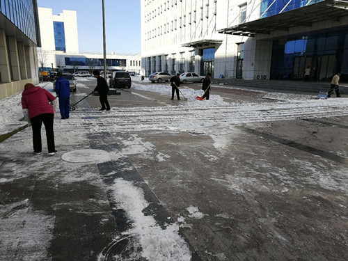 降雪持續(xù)一上午,項(xiàng)目人員不懼嚴(yán)寒反復(fù)清掃園區(qū)主干道、辦公樓臺(tái)階。對(duì)積雪較厚、壓實(shí)路段做撒鹽融雪處理,在鐵锨、除雪車“咣咣嚓嚓”中,積雪被鏟除干凈,道路逐漸恢復(fù)原貌,全力保障車輛和人員安全出行。