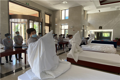 培訓(xùn)在前,提升在后。5月28日,客房舉行中式鋪床技能大賽,房務(wù)部員工即興賦詩(shī):“首陽(yáng)山下鋪床忙,被角里面有文章,技能提升來(lái)分曉,處處增添好景象”。