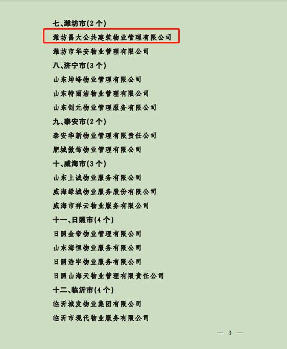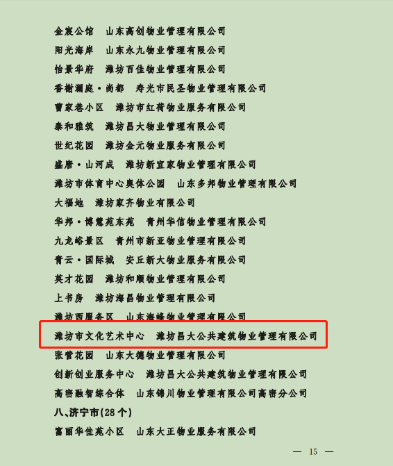 9月3日,山東省住房和城鄉(xiāng)建設(shè)廳公布關(guān)于品牌建設(shè)典型示范案例和“質(zhì)量標(biāo)桿”項目(第二批)名單,我公司作為品牌建設(shè)典型示范案例予以公布、服務(wù)管理的濰坊市文化藝術(shù)中心和峽山區(qū)創(chuàng)新創(chuàng)業(yè)服務(wù)中心同時獲得質(zhì)量標(biāo)桿項目。